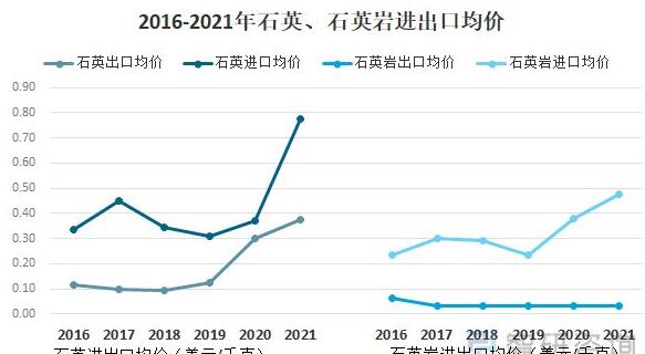 我國石英及石英巖全體進口均價繼續領先,2021年進口均價為0.69美元/千克,出口均價僅為0.2美元/千克。